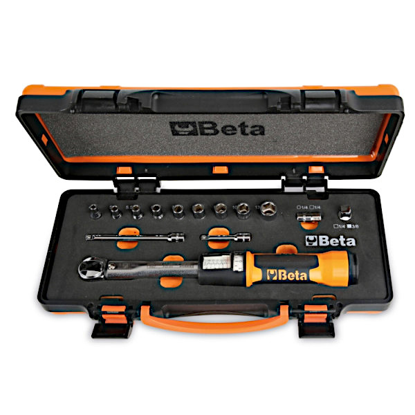14-teiliges Sortiment mit Schraubenschlüssel 666/2 (5÷25 Nm) mit 1/4"-Einsatz, Sechskant-Einsätzen 900 (4÷13 mm), Verlängerungen 900/... (50-100 mm) und Verschraubungen 900/16 und 895/1. Geliefert in einem Kasten aus zwei Materialien für maximalen Schutz und Ordnung.