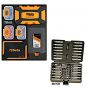 - Arbeitsplatte aus edelstahlbeschichtetem MDF, mit Bohrungen zum Einbringen eines Schraubstocks (Art. 1599F/125 oder 1599GI/125, separat zu bestellen) und 6 Aufnahmeschalen für Kleinteile